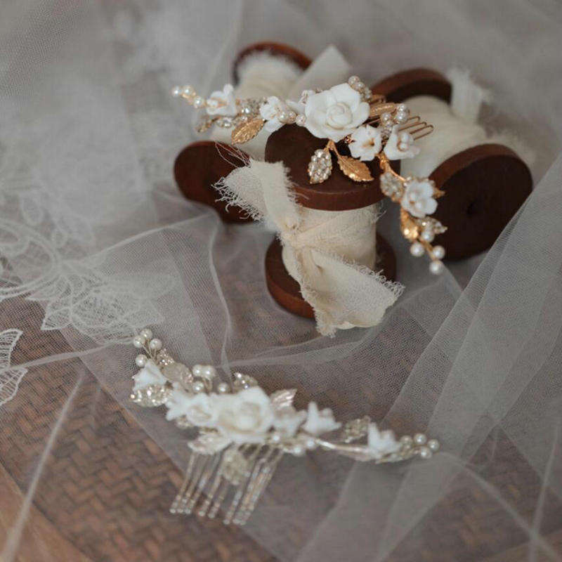 TL Pettine per capelli artigianale da sposa e damigella in ceramica con fiori, perline, cristalli/strass, lega, 15 cm