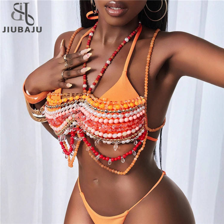 Bralette Arancione Artigianale con Perline Glitterate da Donna, Copricostume da Spiaggia, Gioiello per il Corpo, Outfit Rave, Top Reggiseno Stratificato con Perle