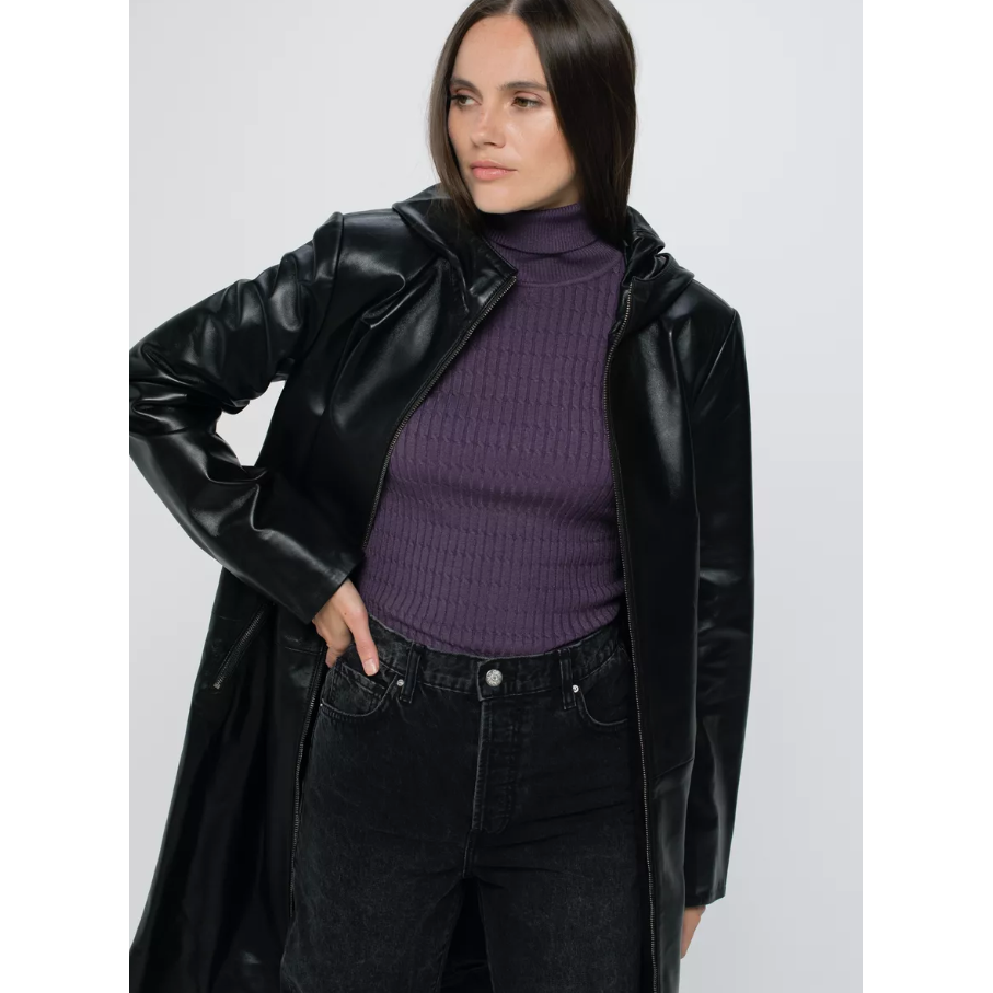 Cappotto in Pelle Nera da Donna con Cappuccio – Fatto a Mano in Vera Pelle di Agnello, Lunghezza Lunga, Chiusura Frontale Comple