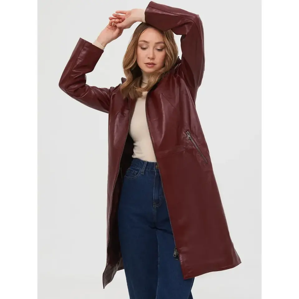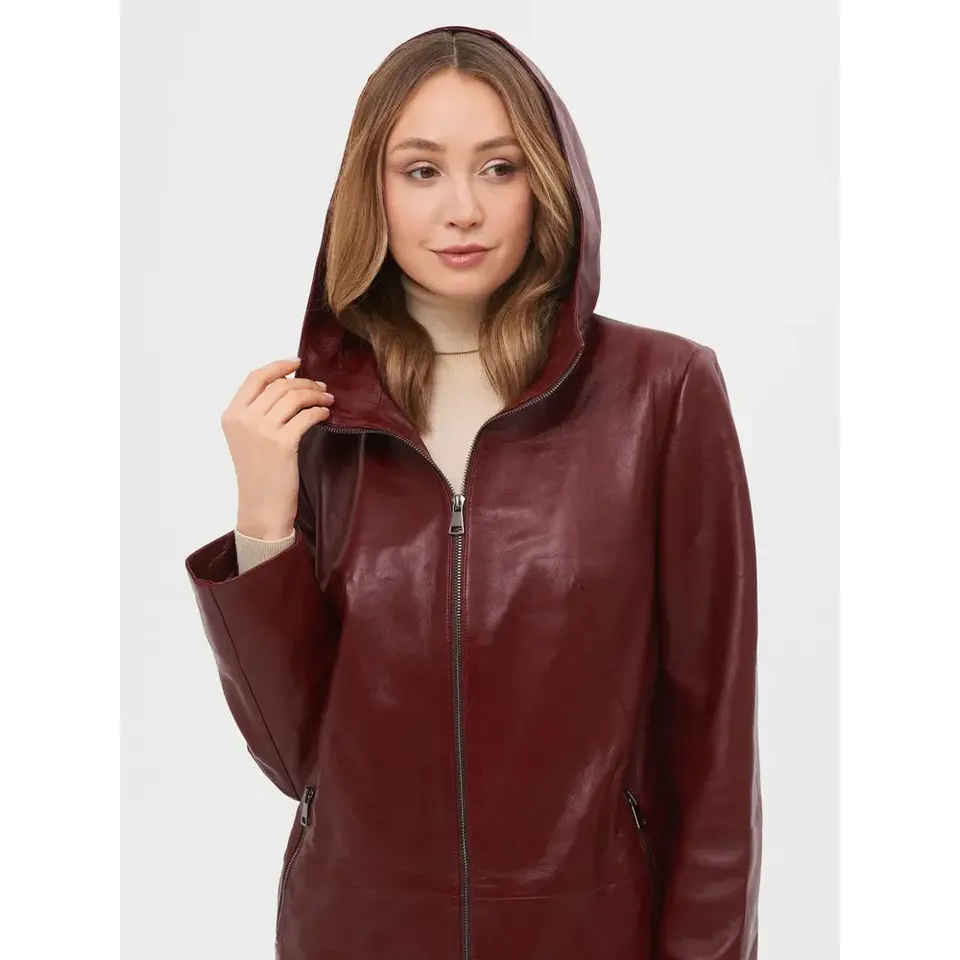 Handmade Premium Lambskin Women's Hooded Leather Coat Burgundy Elegantly Functional Long Jacket Zip Closure OEM Wholesale Supply