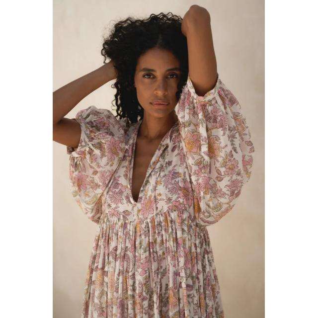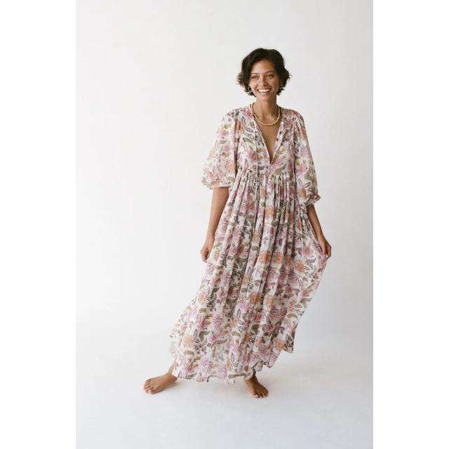 Abito Lungo Kyra Fatto a Mano di Qualità Premium, 100% Cotone, Stampa Fucsia con Illustrazione Incantevole di Arte Antica, Lavabile