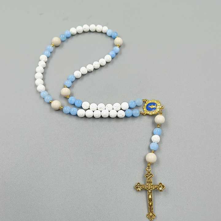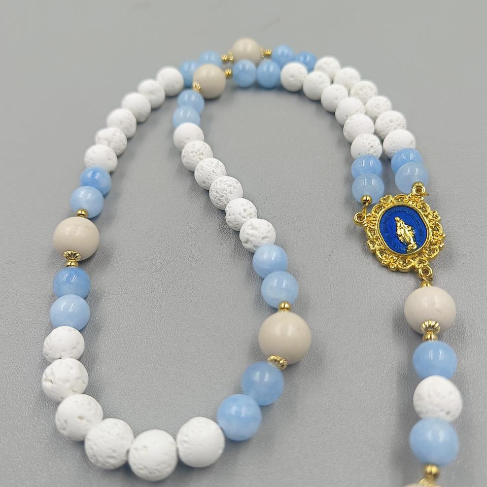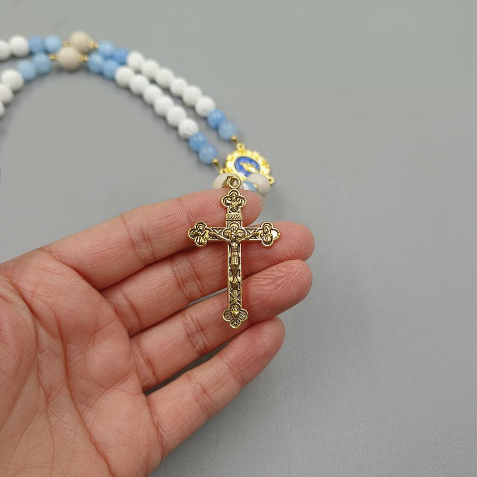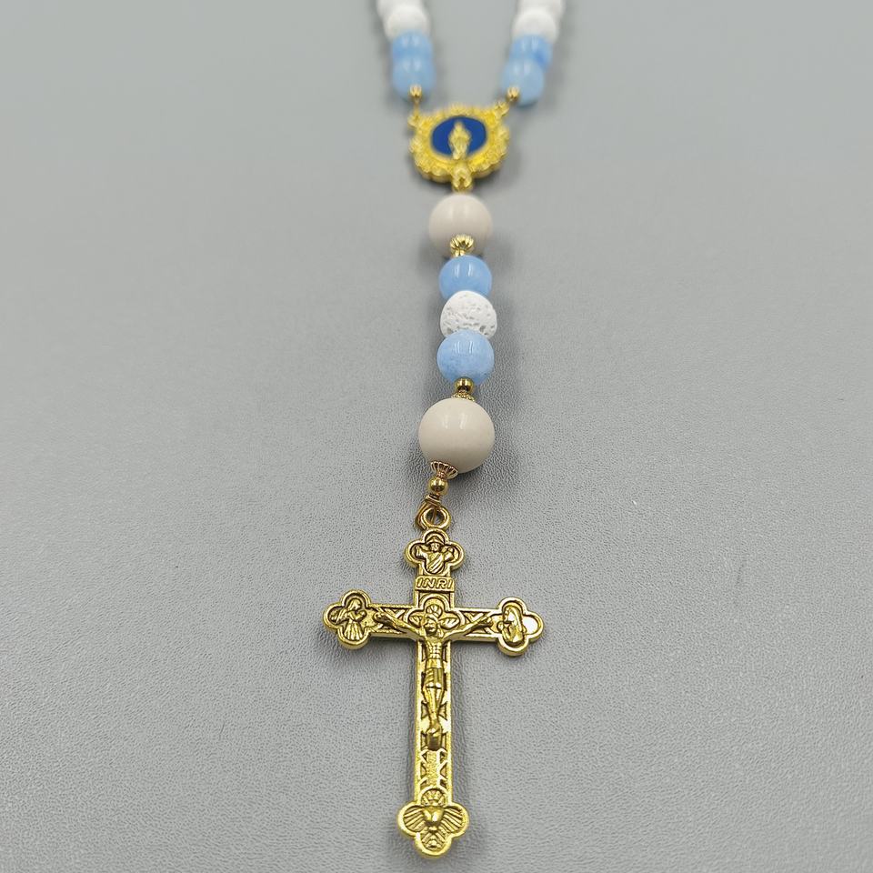 Handmade Rosary Bracelet Gold Virgin Mary Crucifix Charm 8mm Blue Gemstone Beads Rosary Catholic Gift for Women