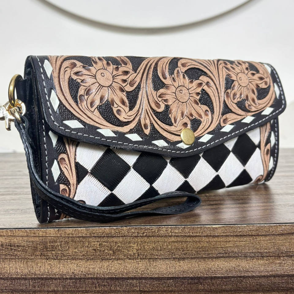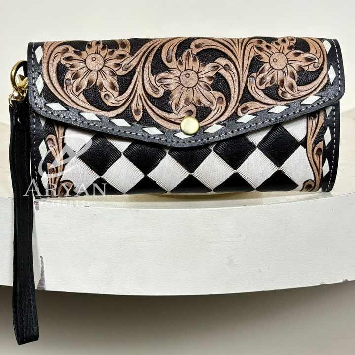 Product name:Hand Tooled Checkered Leather Wristlet Clutch