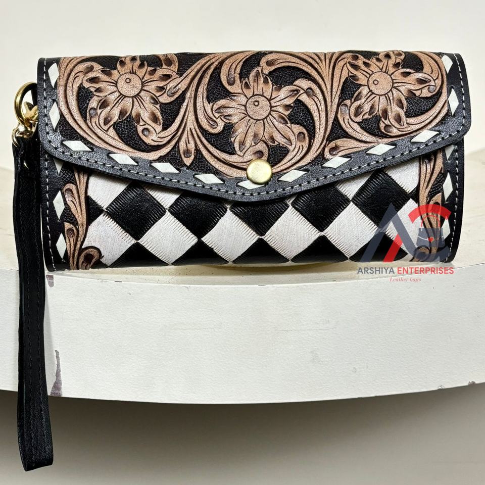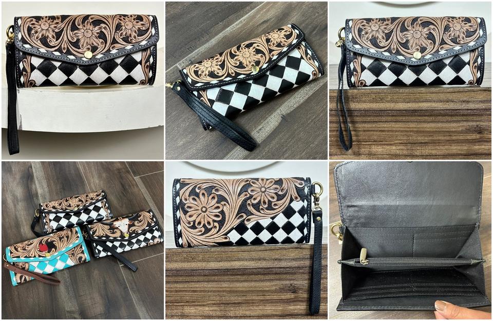 Hand Tooled Checkered Leather Wristlet Wallet