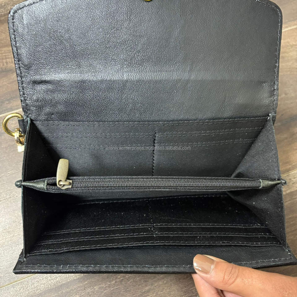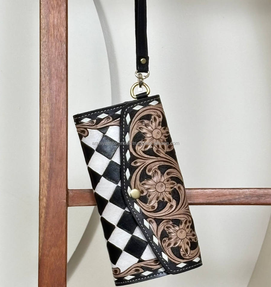 Portafoglio in Pelle di Vacchetta Lavorata a Mano, Pochette Lunga da Donna con Design Floreale a Quadretti Bianco e Nero, Portafoglio di Lusso Personalizzato