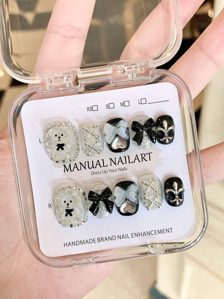 Adesivi per Unghie Fatti a Mano con Orsetto Cartoon e Fiocco Bianco e Nero, Unghie Finte Pronte all'Uso