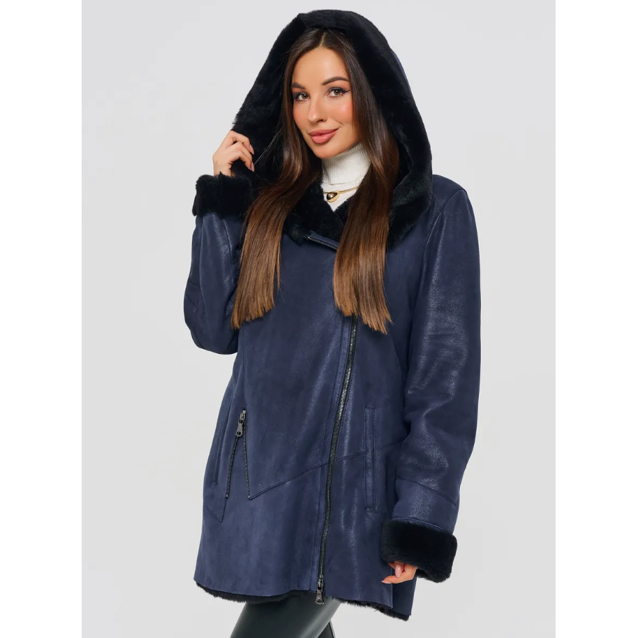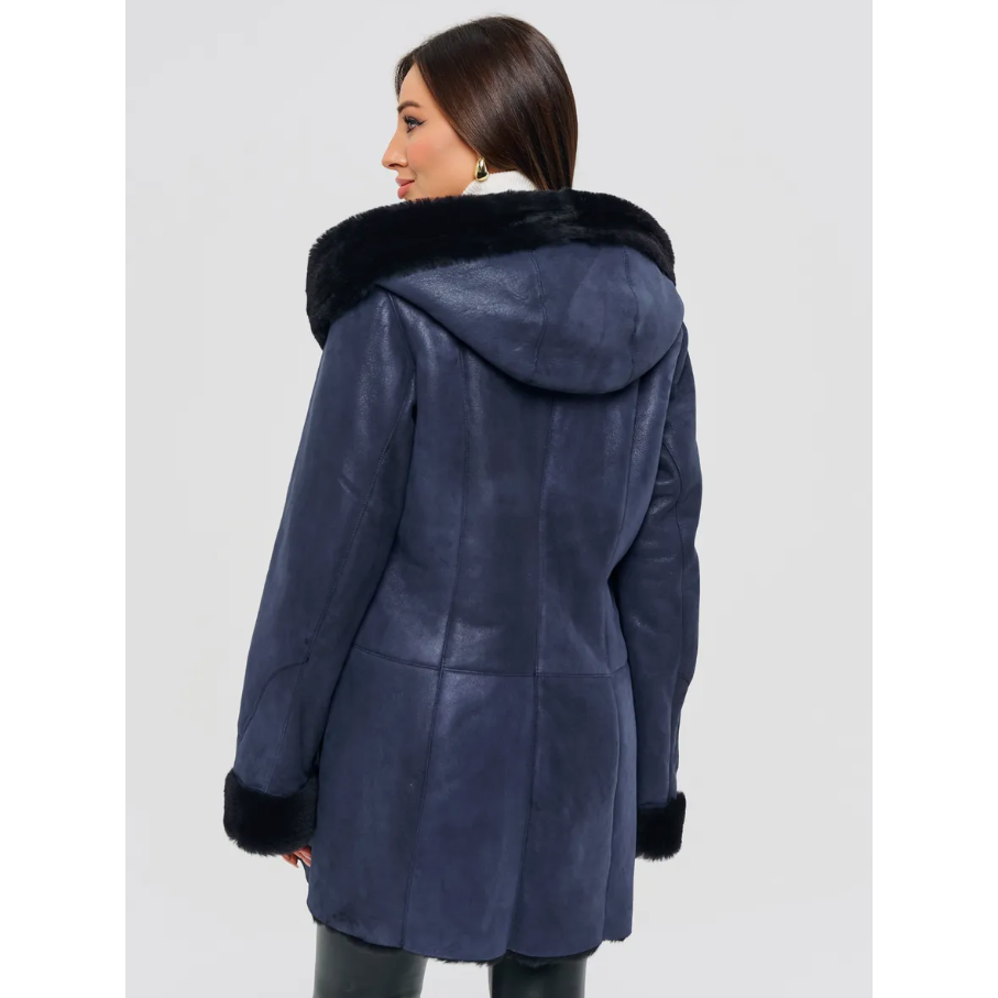 Cappotto in shearling scamosciato blu navy con cappuccio per donna – Giacca invernale in vera pelle di agnello