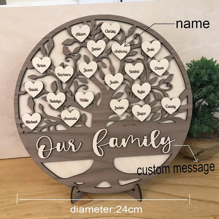 Decorazione in legno fatta a mano albero genealogico personalizzato nome di famiglia segno con nomi a forma di cuore