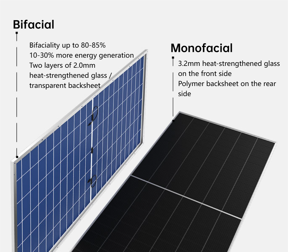 Design bifacciale: Il design bifacciale consente al pannello di catturare la luce solare da entrambi i lati, aumentando il rendimento energetico e l'efficienza complessiva.