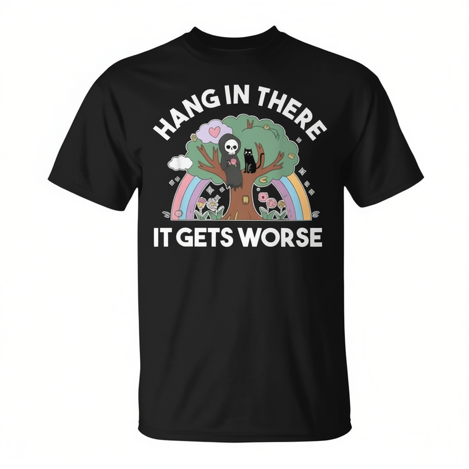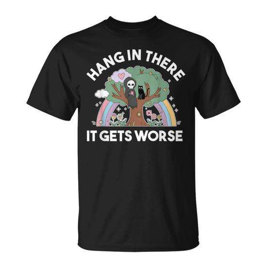 T-shirt Hang In There IT Gets Worse Reaper con design Existential Dread