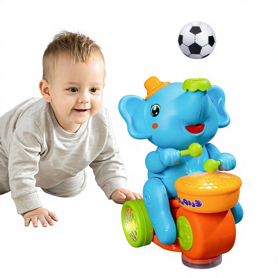 Auto Elettrica per Bambini a Forma di Elefantino con Palloncino Soffiante, Luci, Musica e Tamburo, Veicolo Omnidirezionale Luminoso