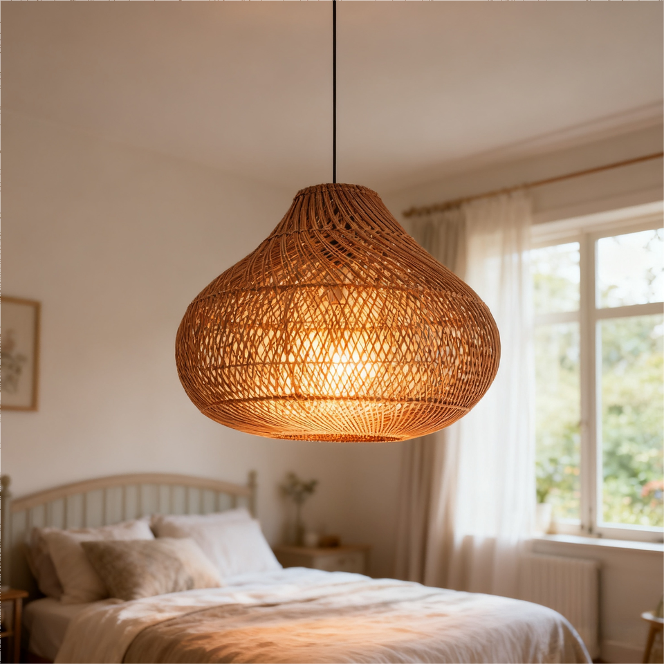 Lampada a Sospensione Artigianale in Rattan, Lampadario per Illuminazione Cucina, Luci Sospese per Casa con Paralume in Bambù Intrecciato