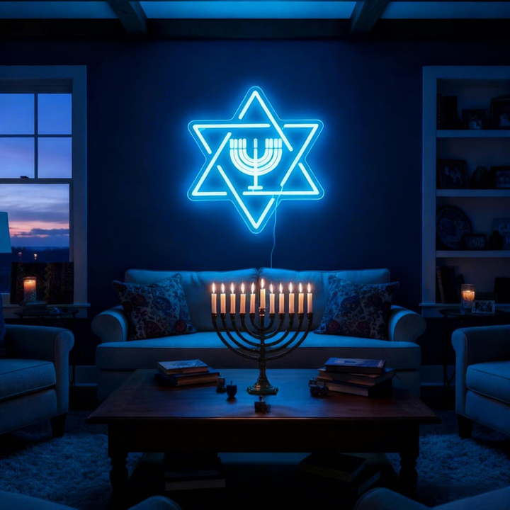 Hanukkah Menorah Blue Star David Neon Sign Customizable Colors IP67 Waterproof Wall Mount Advertising Car Jewish Holiday