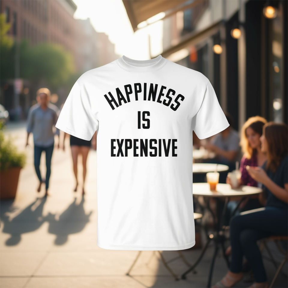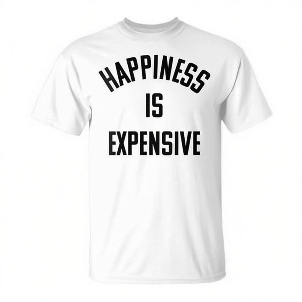 T-shirt Happiness Is Expensive, girocollo bianco, unisex per adulti, a maniche corte, promozionale