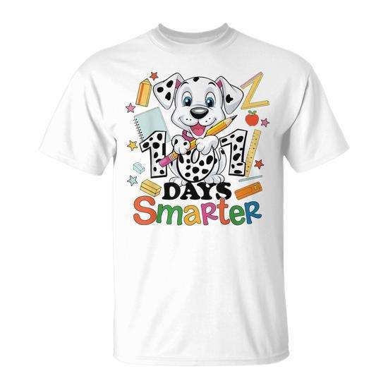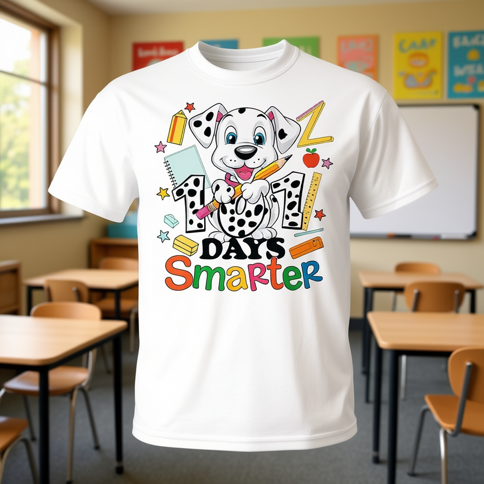 Maglietta Promozionale '101 Giorni di Scuola Migliore' con Simpatico Cane, Studente e Insegnante