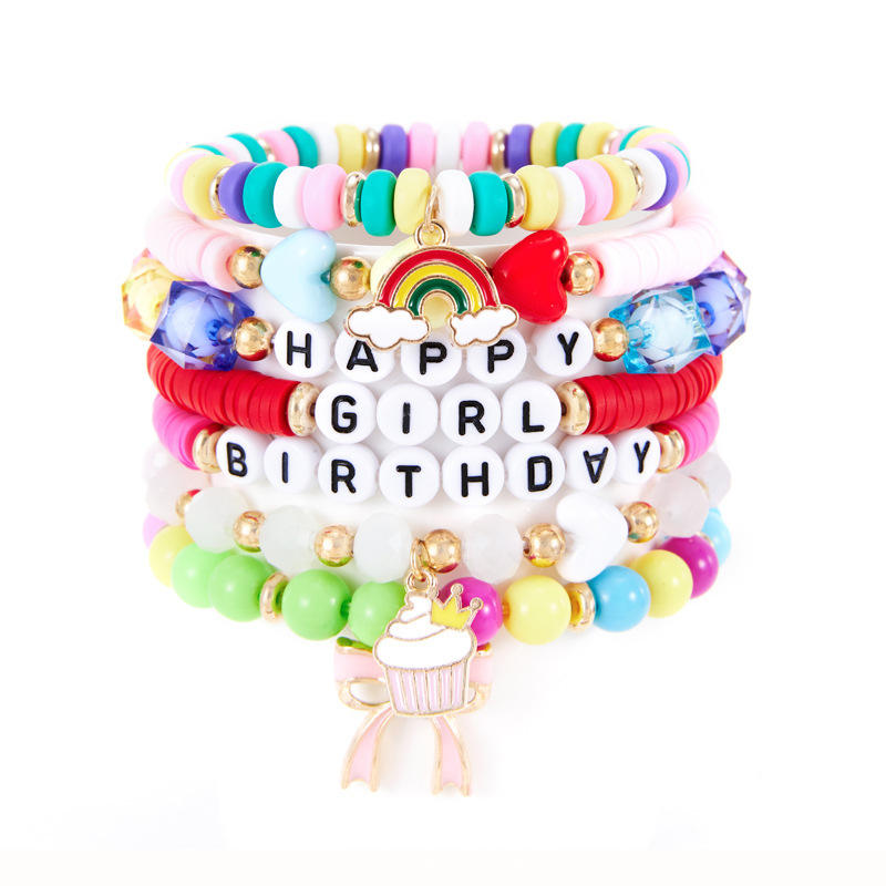 Happy Birthday Bohemian 7-Piece Gift Set Sweet Cute Colorful Cake Bow Pendant Elastic Bracelet Set