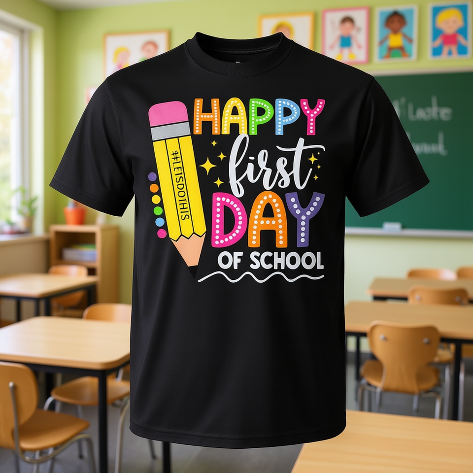 Happy First Day Of School Teacher T-Shirt Back To School Fun Design Black Adult Size