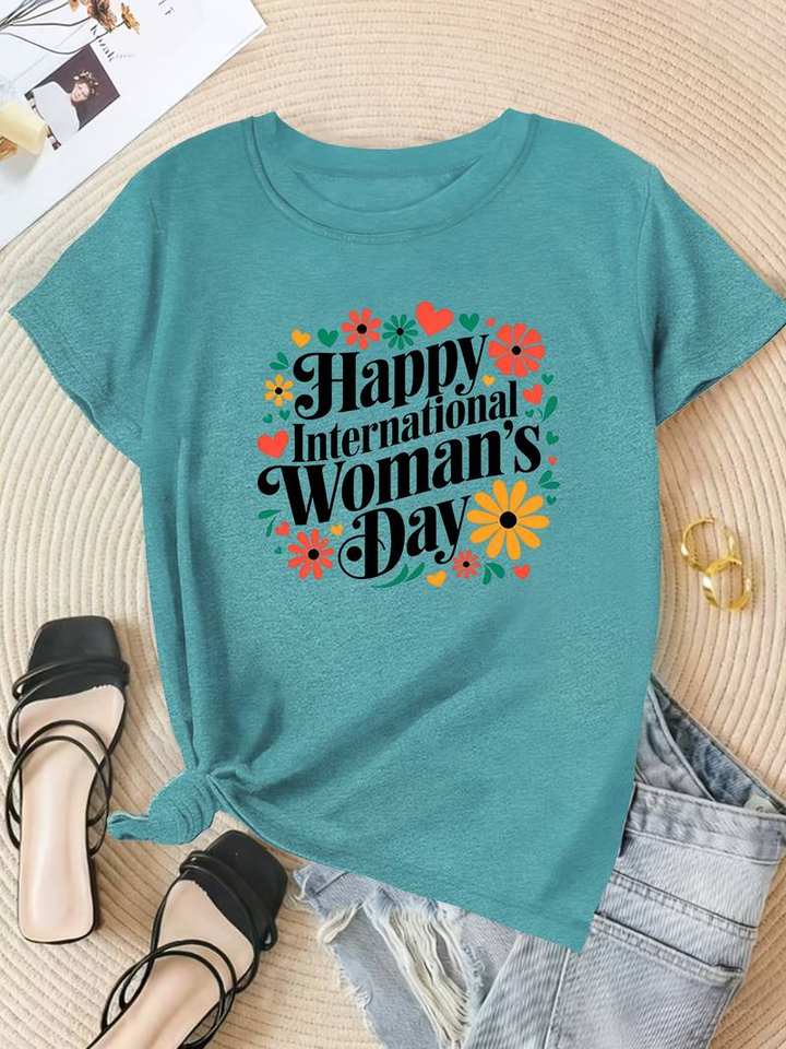 Happy International Women's Day T-Shirt For Women Short Sleeve Round Neck Floral Print Casual Spring Style 100 Cotton Jersey Top