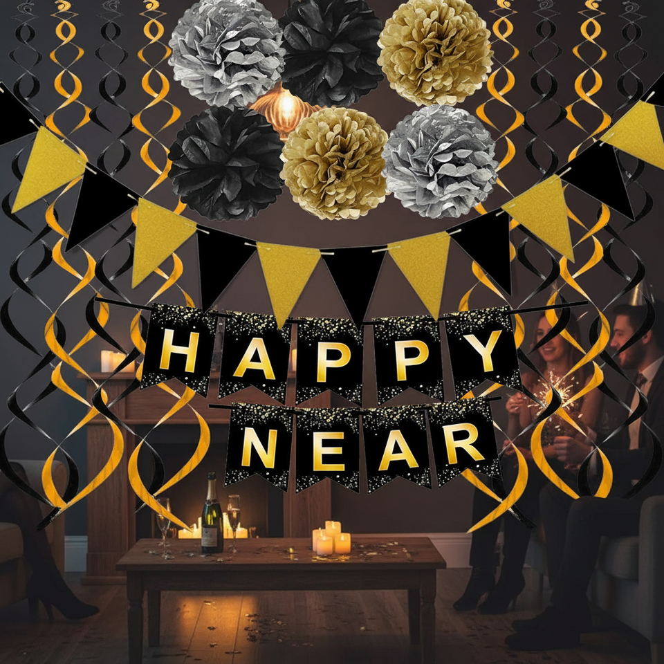 Set Decorazioni per Festa di Capodanno, Striscione Nero con Pon Pon Dorati, Bandierine di Carta, Ghirlande a Spirale, Streamer in Nero e Oro