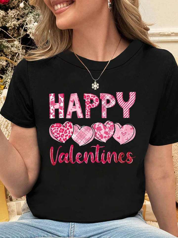 Happy Valentine Heart Pattern Plus Size Women's Casual Round Neck Short Sleeve T-Shirt Spring Summer Cotton Jersey Print