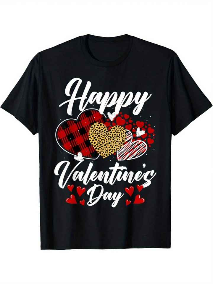 Happy Valentine's Day Leopard Heart Print 180g Pure T-Shirt Short Sleeve Unisex Casual Gift Jersey Crew Neck