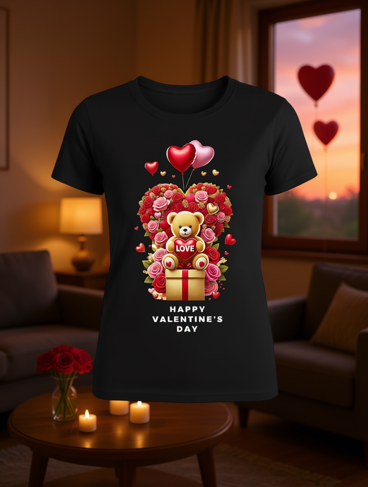 Happy Valentine's Day Plush Bear Printed T-Shirt Women Short Sleeve Round Neck Casual Spring Summer Gift Outfit