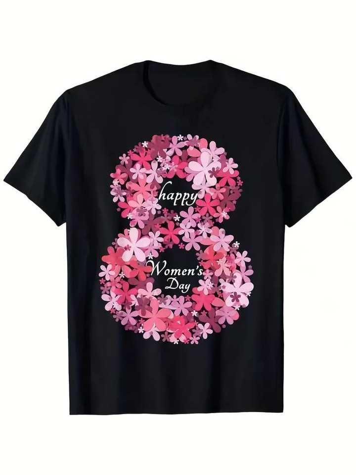 Happy Women's Day T-Shirt Floral Female Symbol Pink Black Round Neck Short Sleeve Casual Celebration Shirt 100% Cotton S-3XL