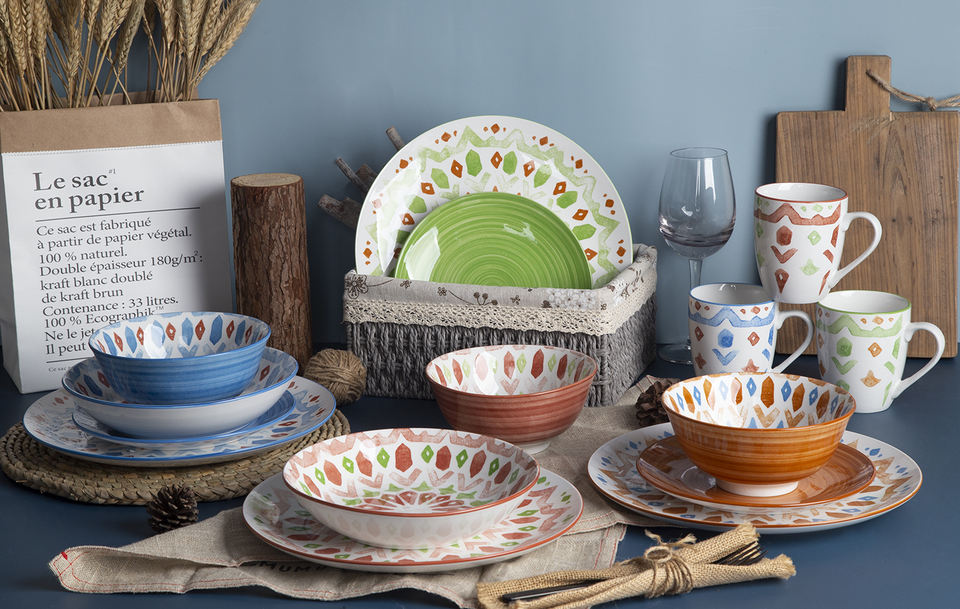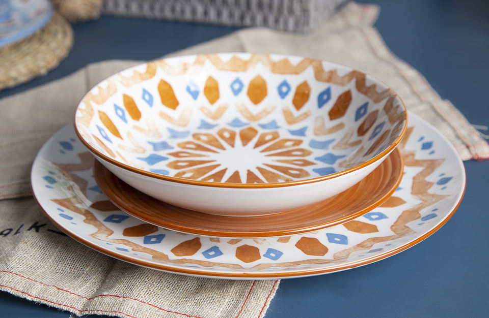 HappyGo High Quality White Porcelain Dinner Plate Set Custom Pad Printed Dining Serveware Flat Bottom Ins Design for Horeca