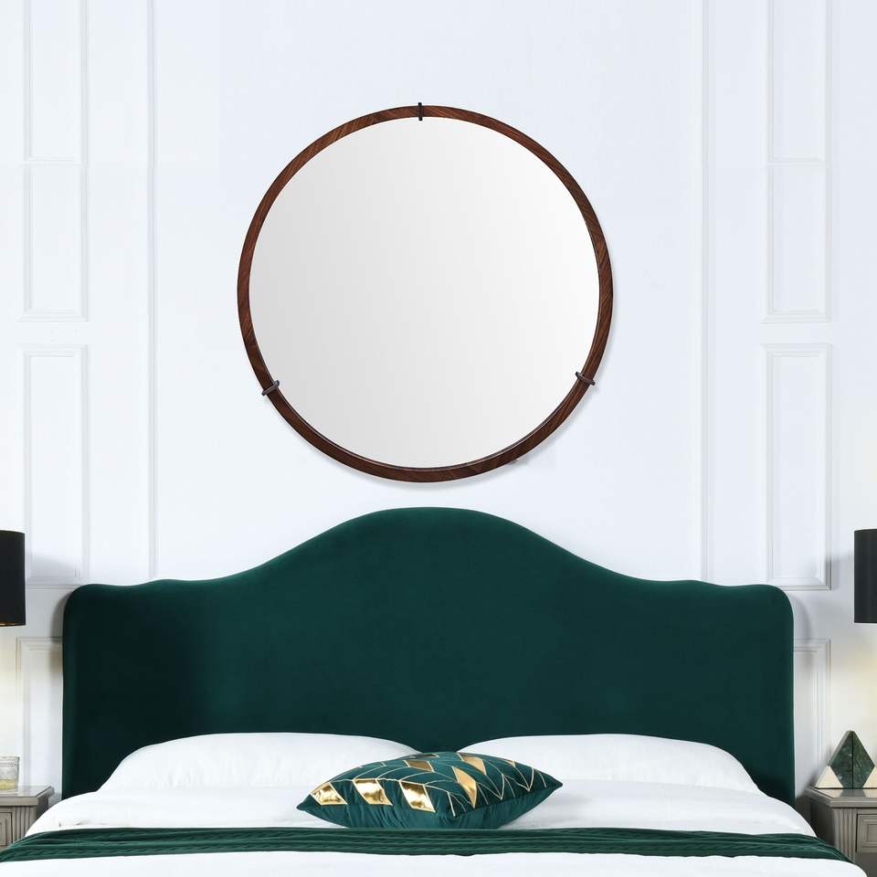 Hausen 31.5\" Mid-Century Modern Round Accent Wall Mirror Brown Walnut Wood & Veneer