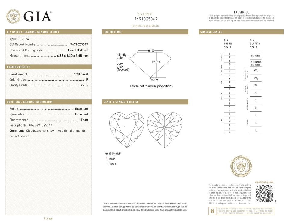 Diamante Naturale Certificato Leyloon, Taglio Cuore 1.70ct F VVS2, Certificato di Autenticità NO. 7491025347