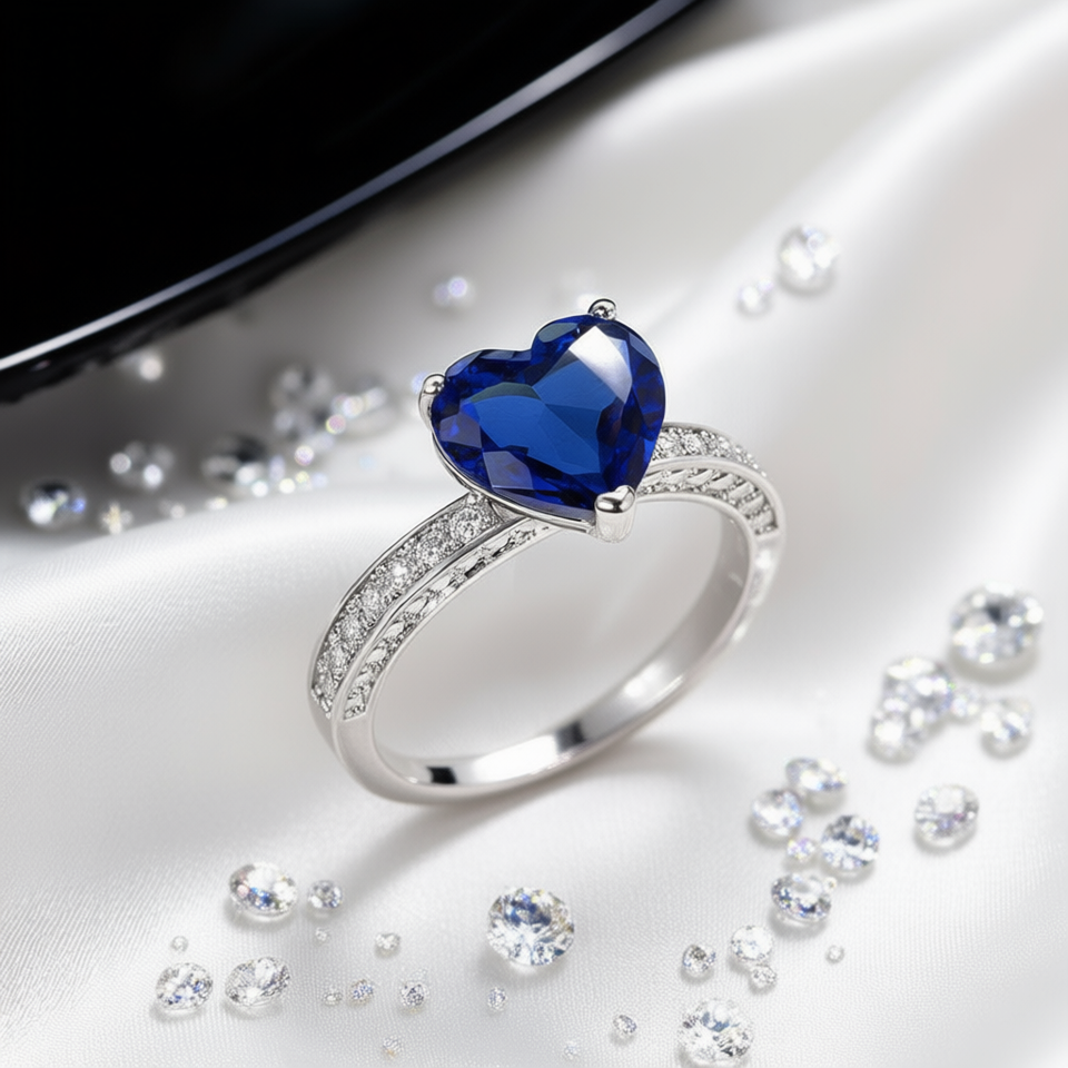 Anello di fidanzamento con zaffiro a taglio a cuore per donna, anello con pietra preziosa in argento 925 con incastonatura a pavé, stile romantico Q186 blu