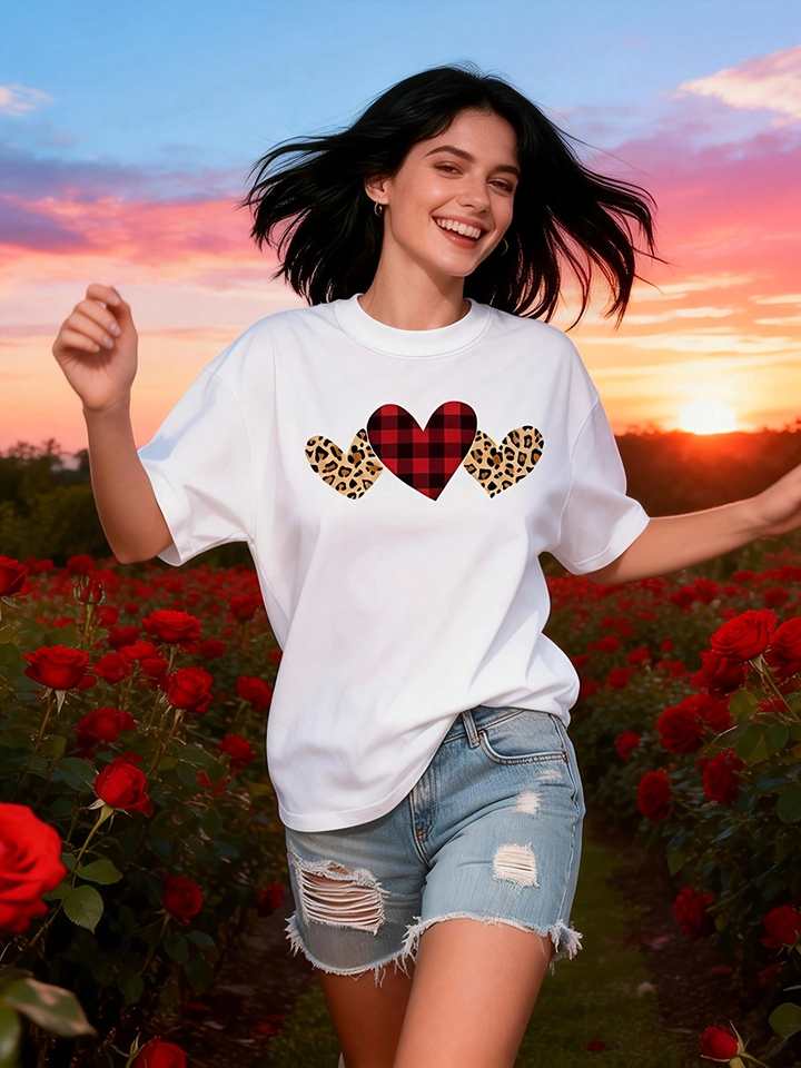 T-shirt con stampa a cuori da donna, manica corta, girocollo, casual, per San Valentino, primavera estate, 100% cotone jersey