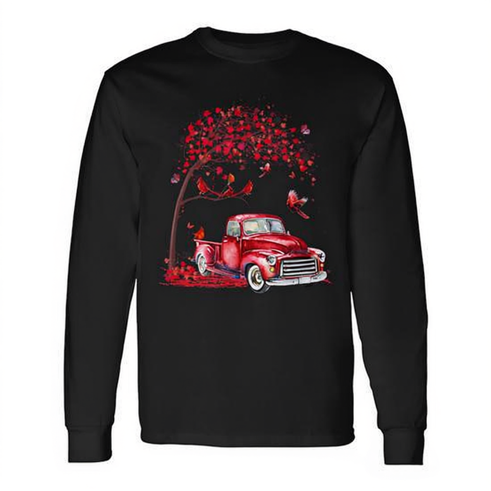 T-shirt a maniche lunghe con cardinale e camion rosso vintage sotto l'albero, abbigliamento promozionale elegante e accattivante