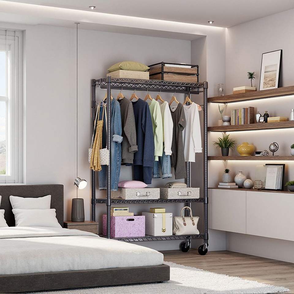 Appendiabiti a 3 livelli su ruote per carichi pesanti, armadio guardaroba in metallo autoportante con 1 asta e appendiabiti in filo metallico