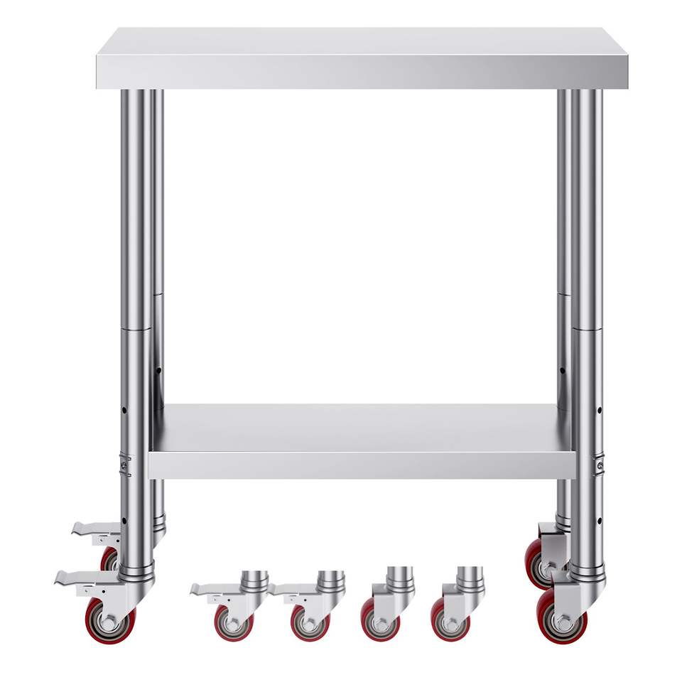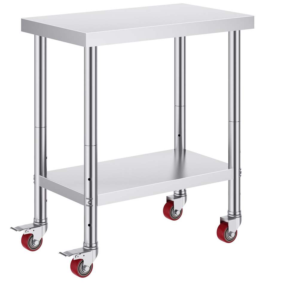 Tavolo da Lavoro in Acciaio Inox Resistente 30 X 18 X 34 Pollici, Capacità di Carico 700 LBS, 4 Ruote, 3 Livelli di Altezza Regolabili, Ripiani Portaoggetti