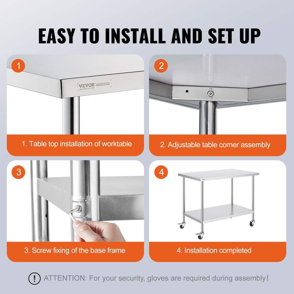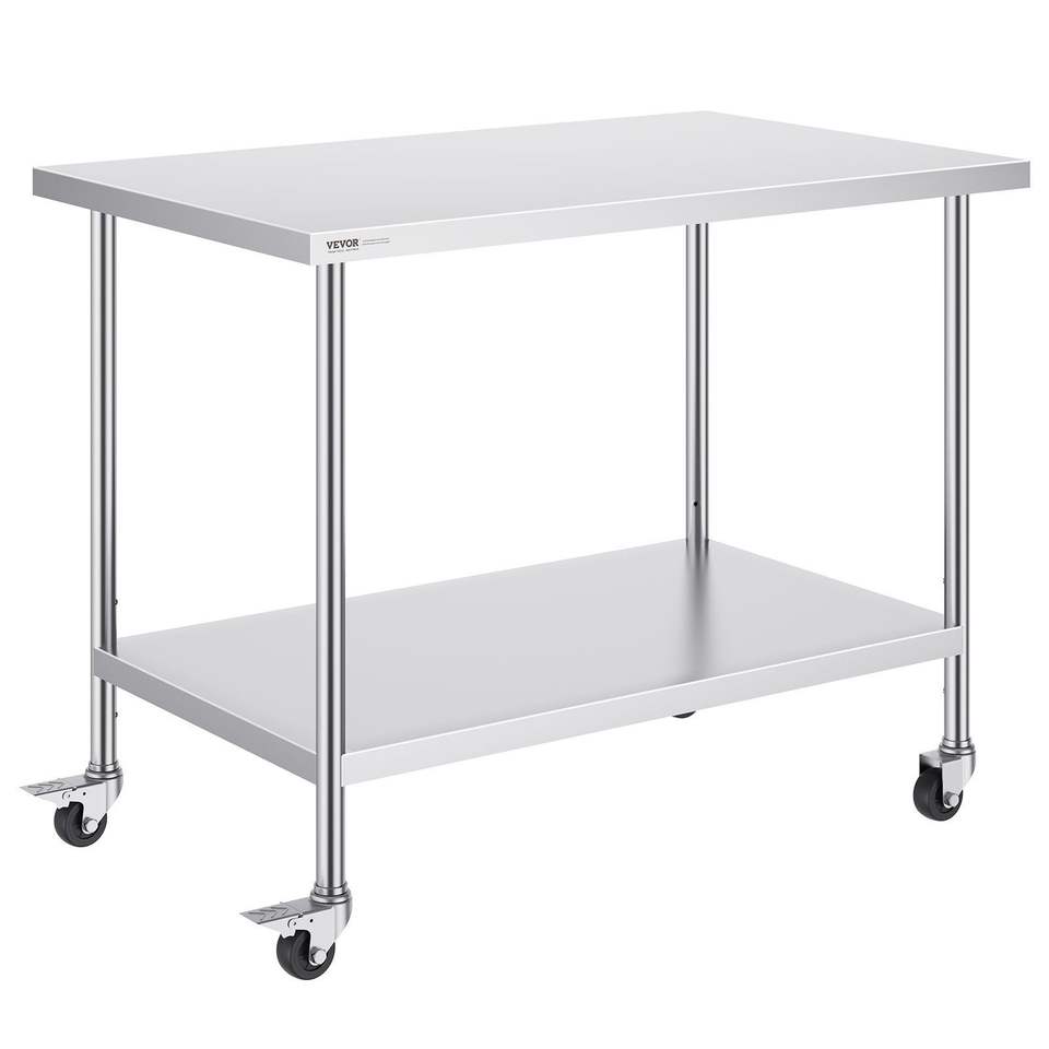Tavolo da Lavoro in Acciaio Inox Resistente 30 X 48 X 38 Pollici, 4 Ruote, 3 Livelli di Altezza Regolabili, per Cucine Commerciali e Fabbricazioni in Acciaio