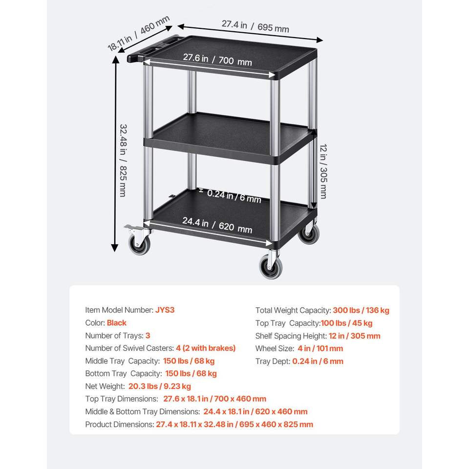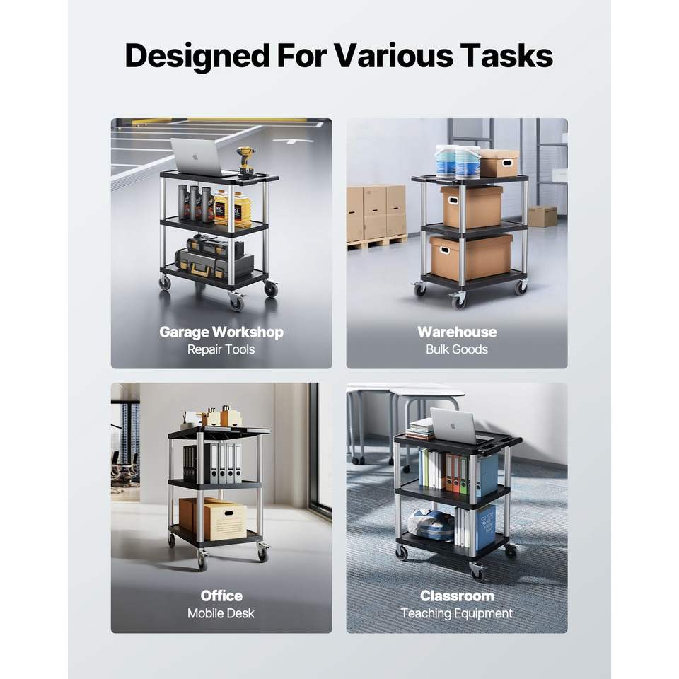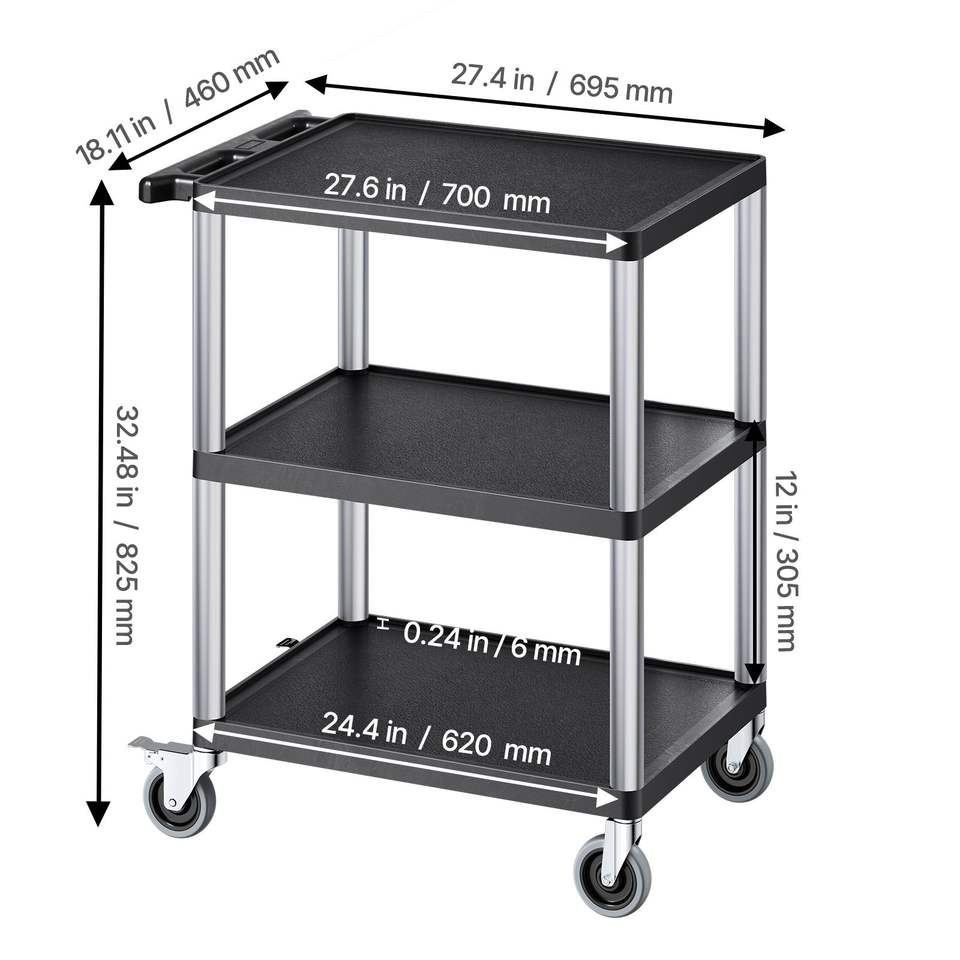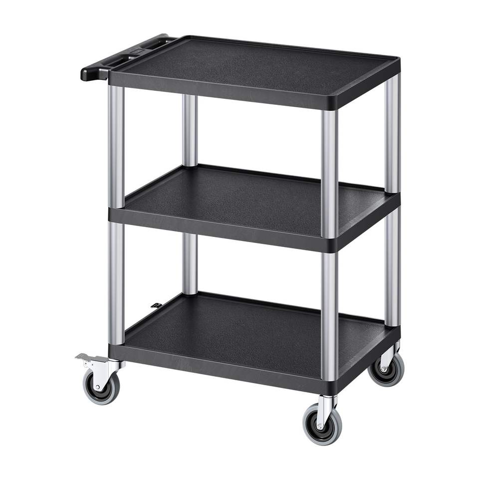 Carrello Multiuso Resistente con Capacità di Carico di 300 Libbre, 27,6 x 18,1 Pollici, Carrello di Servizio con Tre Ripiani Girevoli a 360 Gradi in Plastica