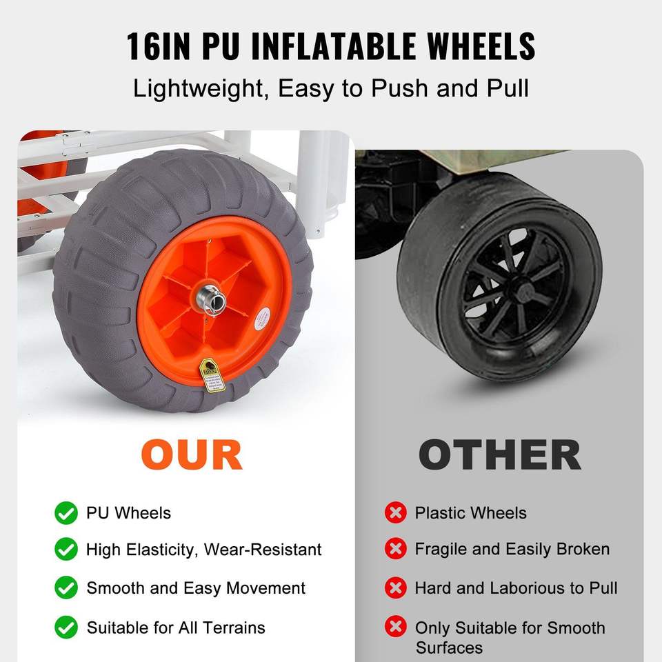 Carrello da Pesca da Spiaggia Resistente con Capacità di Carico di 158 Kg, Due Grandi Ruote da 16 Pollici con Pneumatici in PU, per Sabbia, Mare, Pesca e Campeggio