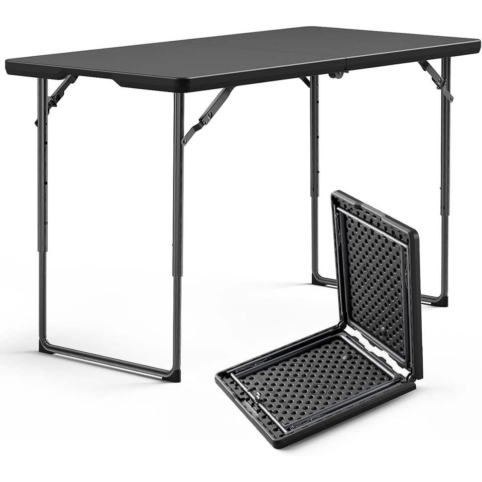 Tavolo Pieghevole Robusto da 120 cm, Altezza Regolabile, Tavoli Utilitari Portatili con Gambe in Acciaio, Design Pieghevole a Metà in Plastica per Casa e Ufficio