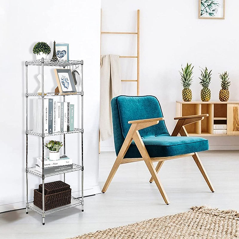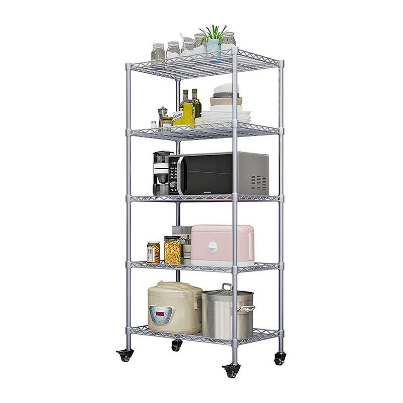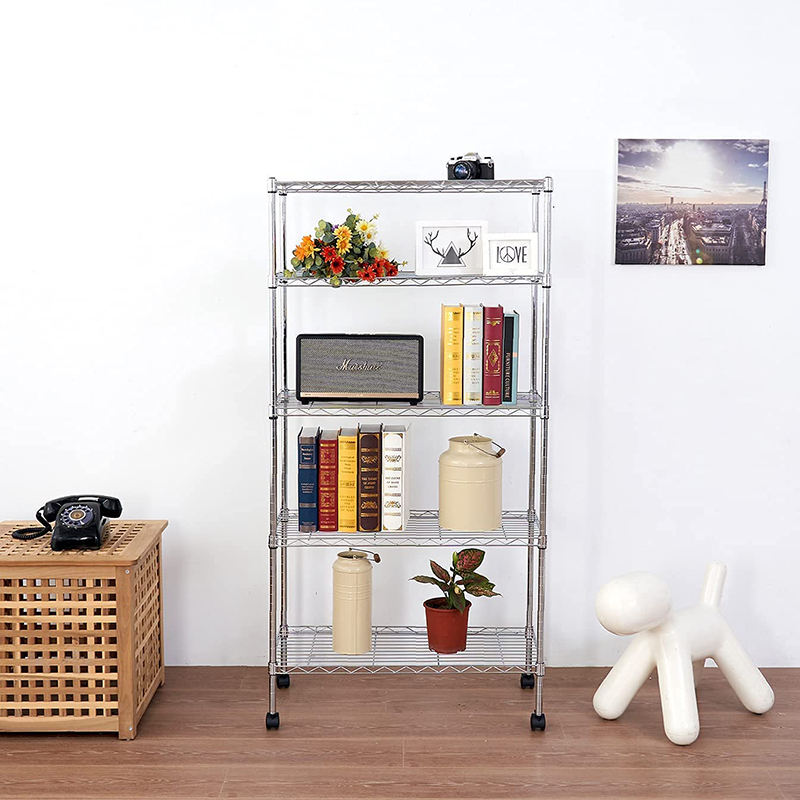Scaffale a 5 Ripiani Resistente con Ruote, Scaffalatura in Filo Metallico Regolabile, Organizzatore in Metallo Cromato per Cucina