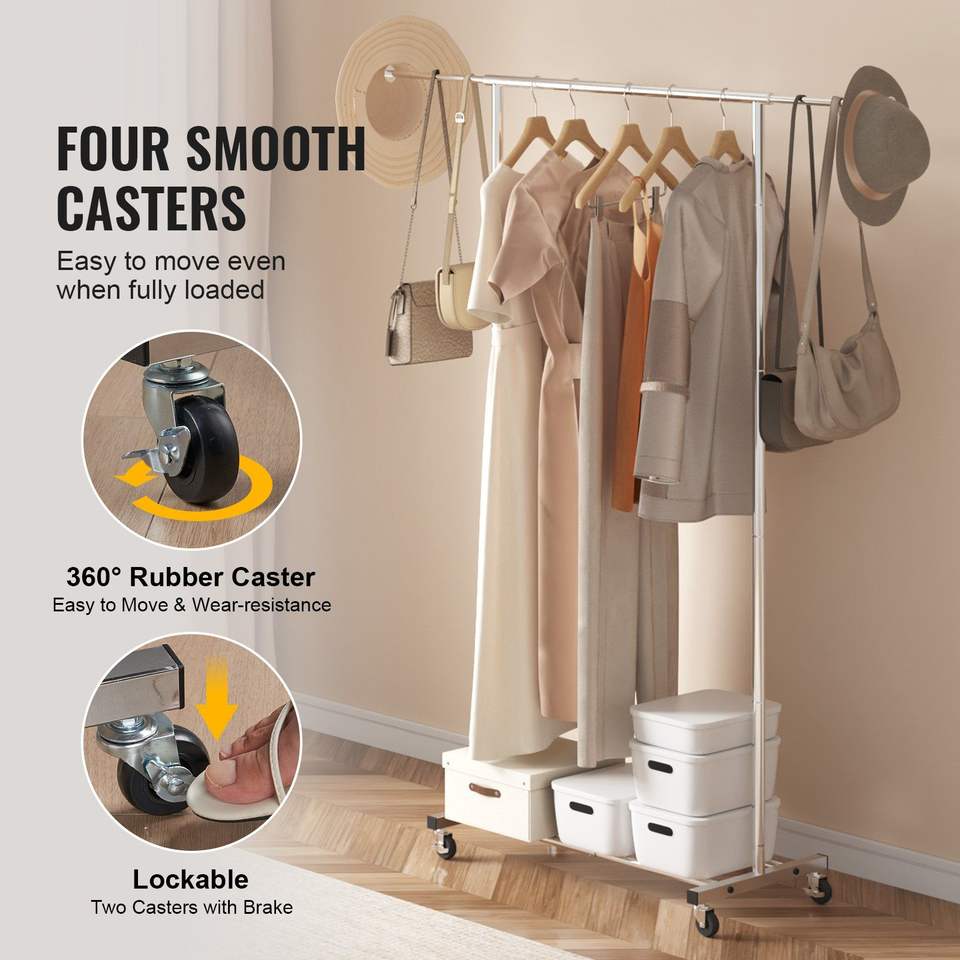 Appendiabiti Robusto Regolabile in Lunghezza con Ruote, Asta Appendiabiti e Area di Stoccaggio Inferiore, Organizzatore per Guardaroba