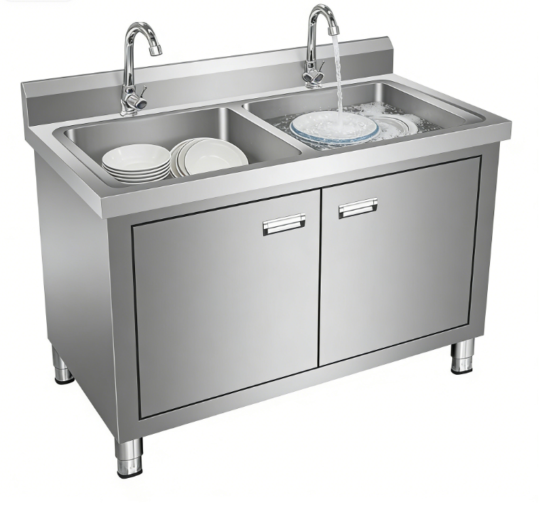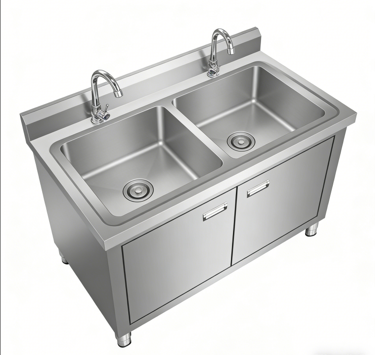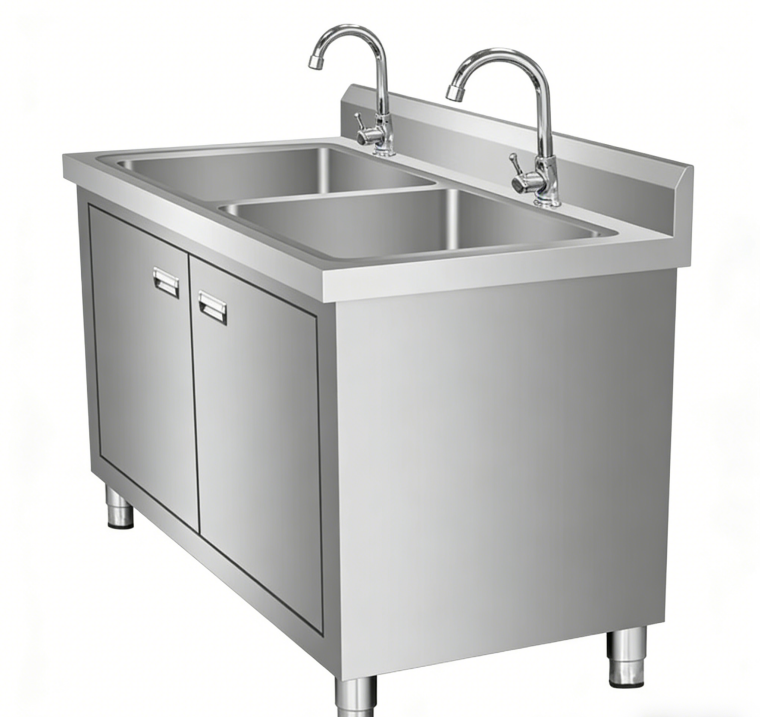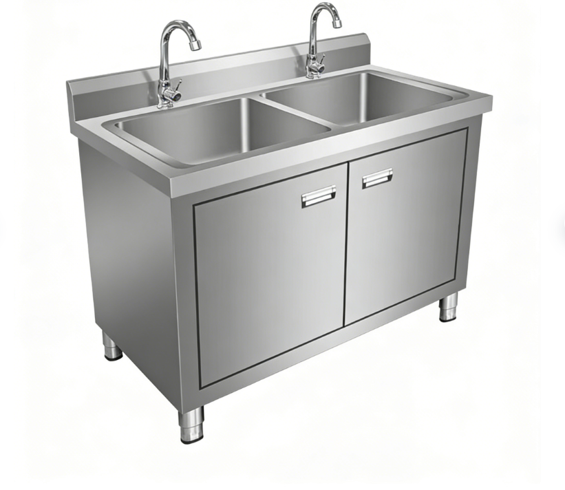 Heavy-Duty Build Hygienic Cabinet Storage Butcher Shop Double Stainless Steel Sink - Meat Processing Area Cleaning Station