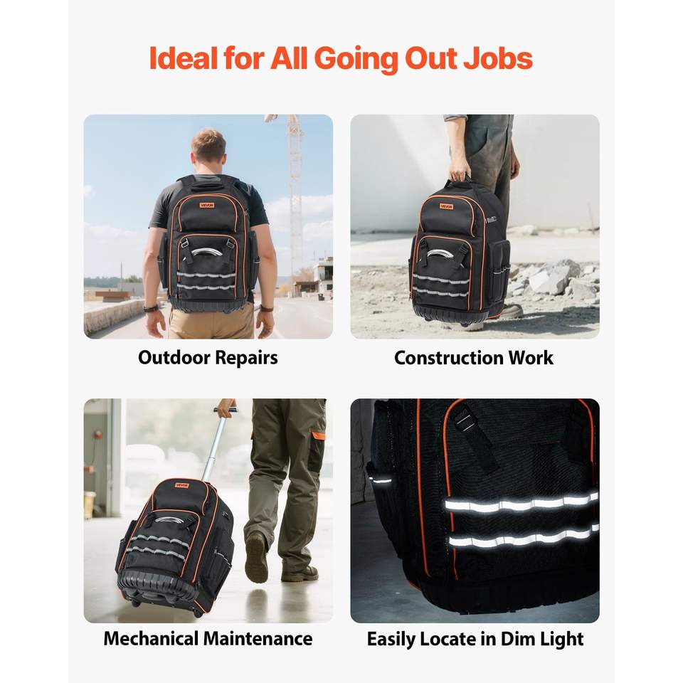 Heavy Duty Rolling Tool Backpack with 72 Pockets Roller Tool Bag on Wheels for Tool Storage and Organization