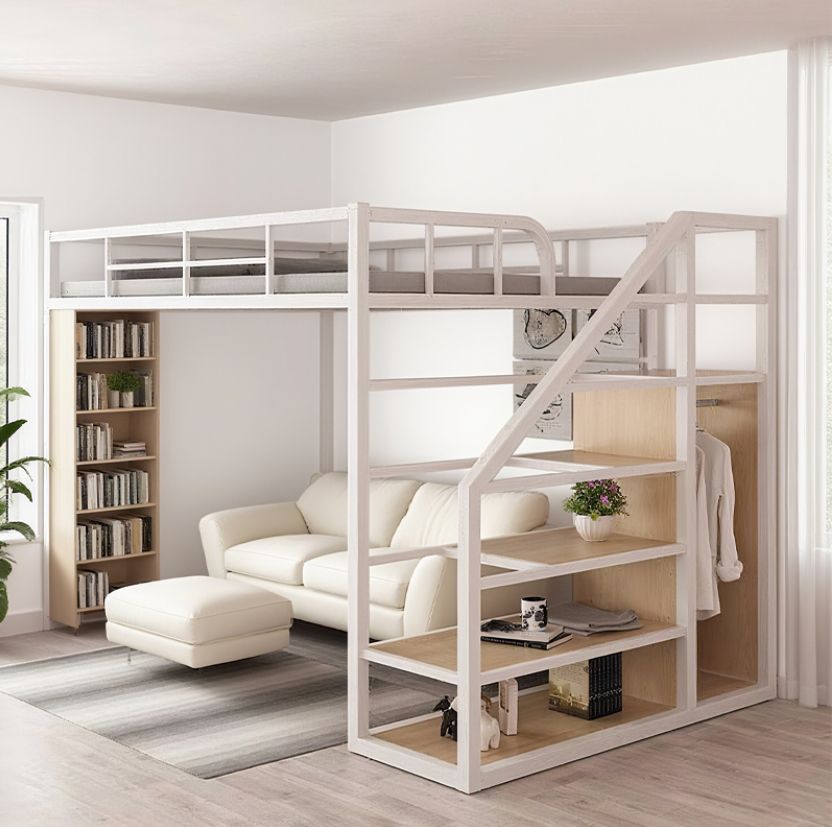 Letto a Soppalco in Acciaio Resistente con Scale in Legno, Design per Letto Singolo, Matrimoniale o Queen Size, Adatto per Adulti