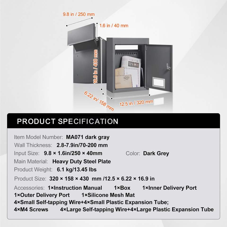 Cassetta Postale da Parete in Acciaio Resistente 2.8-7.9'' 13'' con Serratura a Combinazione 12.5x6.3x16.9 per Consegna Posta