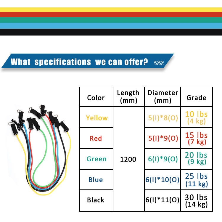 Set di fasce di resistenza per tubi in TPE da allenamento con resistenza alla tensione da 11 pezziNome del prodotto