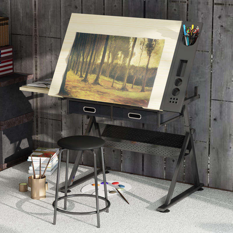 Tavolo da Disegno Regolabile in Altezza - Cavalletto in Metallo con Superficie Inclinabile, Spazio di Archiviazione e Sgabello