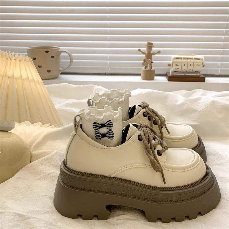Scarpe basse da donna in pelle con suola spessa che aumentano l'altezza, tinta unita, autunno 2024, nuovo modello versatile, stile retrò britannico con lacci