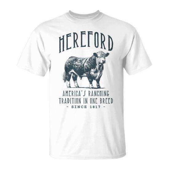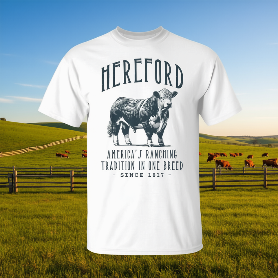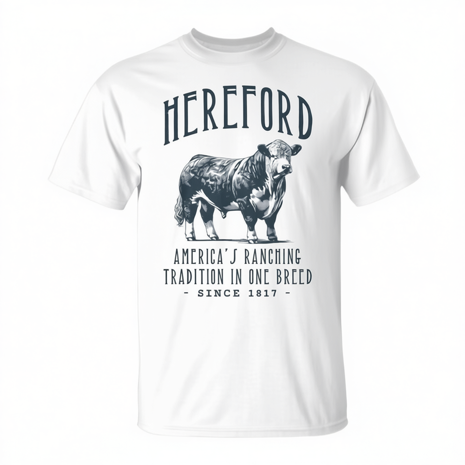 T-shirt vintage con stampa di bovini Hereford: Tradizione del ranching dal 1817