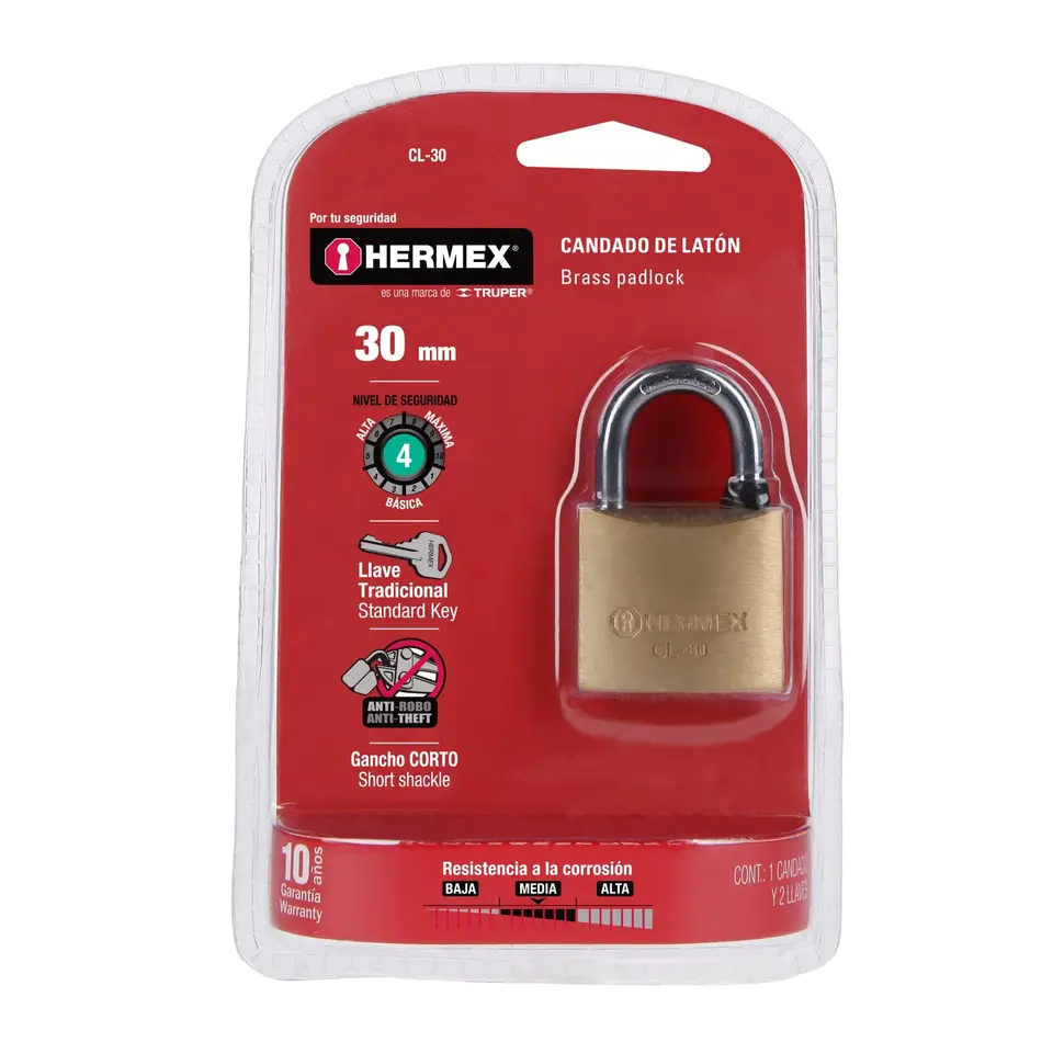 BOX 3 Lucchetto in Ottone 30mm con Gancio Corto in Confezione Blister, HERMEX